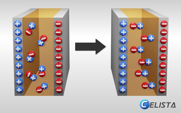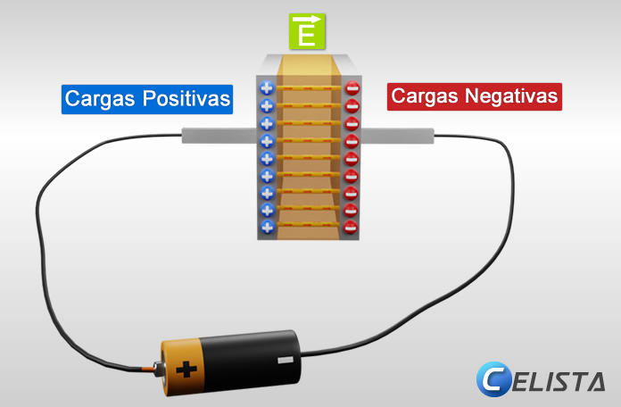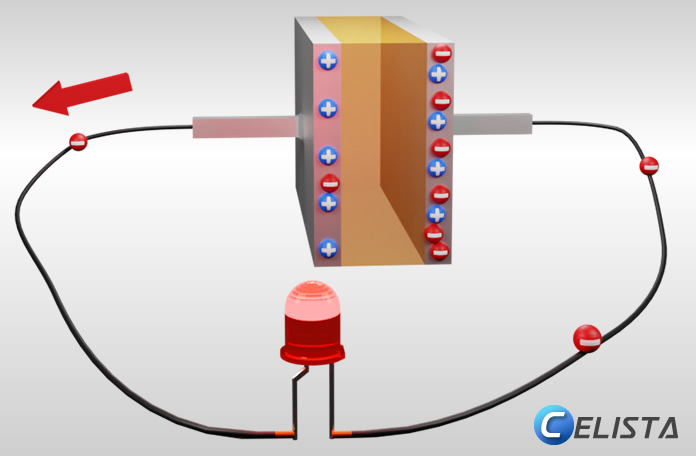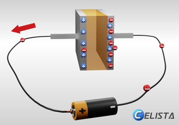 Se conectarmos uma fonte de energia ou uma bateria às placas metálicas do capacitor, uma corrente tentará fluir, ou os elétrons da placa conectada ao terminal positivo da bateria começarão a se mover para a placa conectada ao terminal negativo da bateria. Porém, por causa do dielétrico entre as placas, os elétrons não conseguirão passar pelo capacitor, então começarão a se acumular na placa.