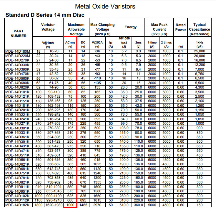 Primeiro verifique qual o fabricante seu fornecedor de componentes possui, por exemplo, imagine que o seu fornecedor tenha varistores da marca MDE, neste caso baixamos o datasheet do fabricante para verificar qual o modelo devemos adquirir com base na coluna ACrms:
